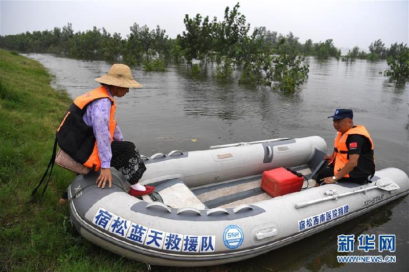 7月15日,汇口镇三洲村村民登上宿松蓝天救援队副队长黄弘(右)驾驶的皮艇准备返回村庄。 新华社记者 刘军喜 摄