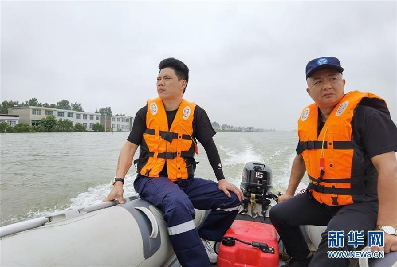 7月16日,宿松县蓝天救援队副队长黄弘(右)与队员一起在泗洲村内巡查(手机拍摄)。 新华社记者 朱青 摄