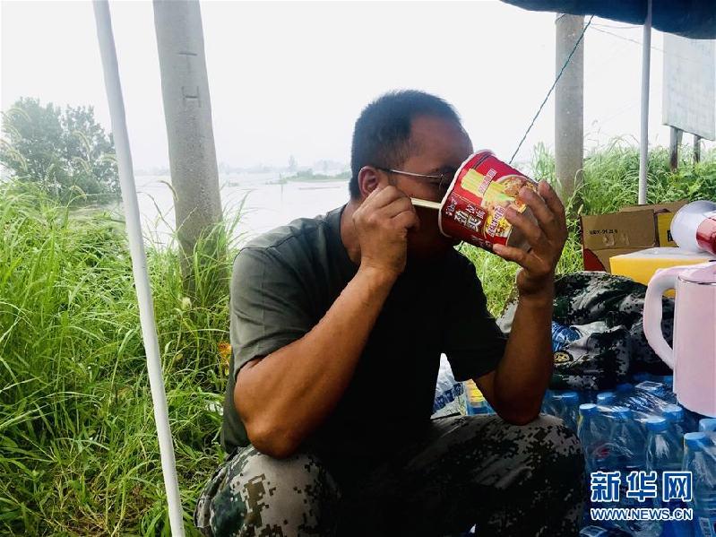 7月15日,支援同马大堤的民兵在吃午饭(手机拍摄)。 新华社记者 李亚彪 摄