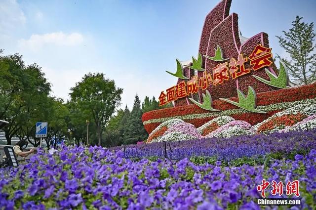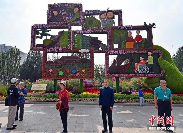 9月26日,市民在北京建国门桥西北角《全面小康》国庆主题花坛前拍照。 中新社记者 张兴龙 摄