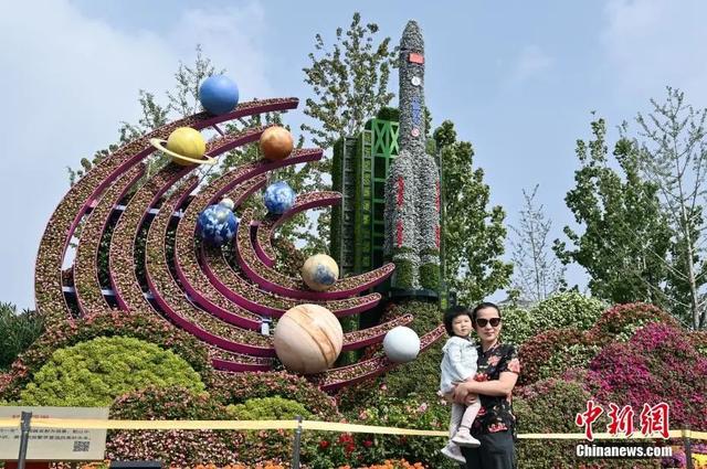 9月26日,市民在北京西单路口东北角《科技强国》国庆主题花坛前拍照留念。中新社记者 张兴龙 摄