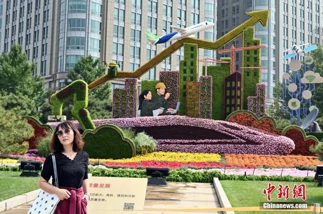 9月26日,市民在北京东单路口东南角《高质量发展》国庆主题花坛前拍照留念。中新社记者 张兴龙 摄