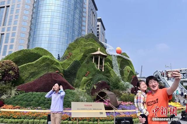 9月26日,市民在北京东单路口西北角《生态文明》国庆主题花坛前自拍。中新社记者 张兴龙 摄