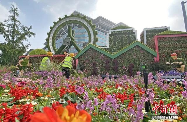 9月26日,工作人员在打理北京西单路口东南角的《人民幸福》国庆主题花坛。中新社记者 张兴龙 摄