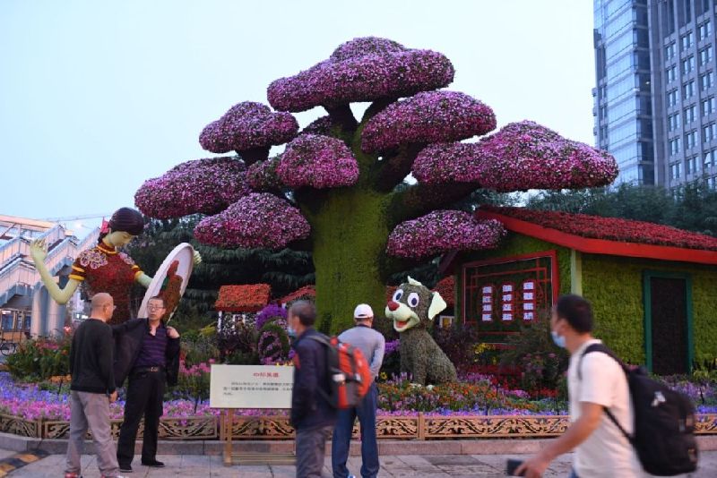 晨曦中,不少早行人在花坛旁驻足观赏,拍照留影,提前感受喜庆的节日气氛。