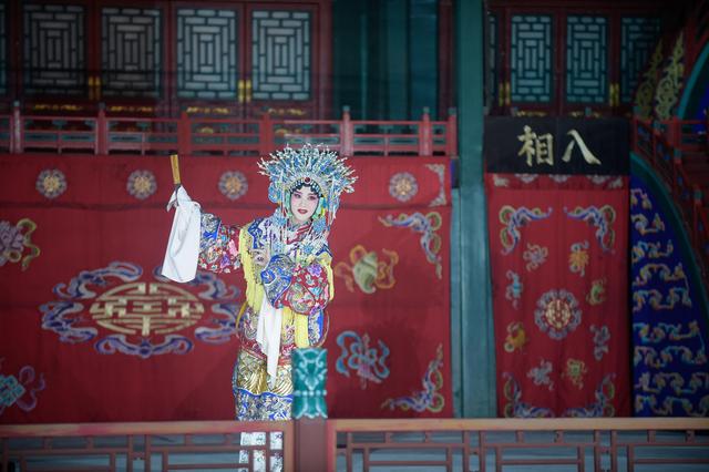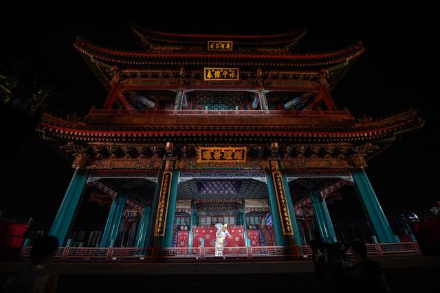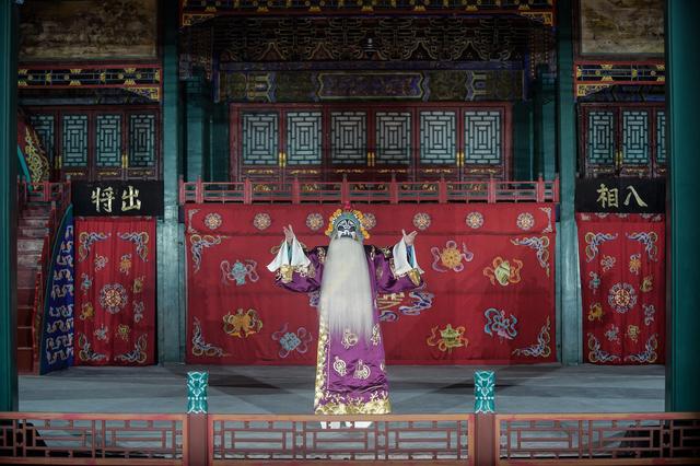 ↑9月28日,演员在德和园大戏楼台上表演,工作人员在台下进行网络直播。