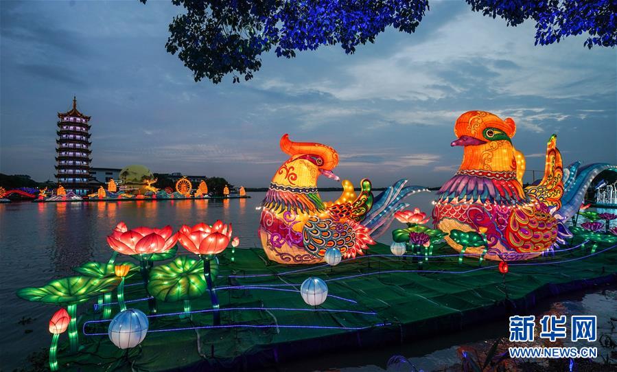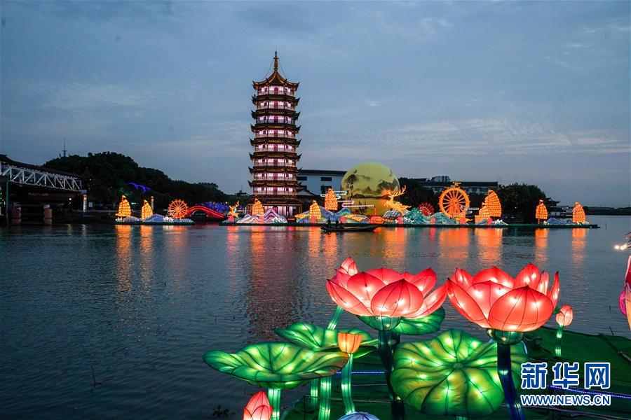 9月28日拍摄的“情意绵绵”灯组(前右)与“月满周庄”灯组(后左)。新华社记者 杨磊 摄