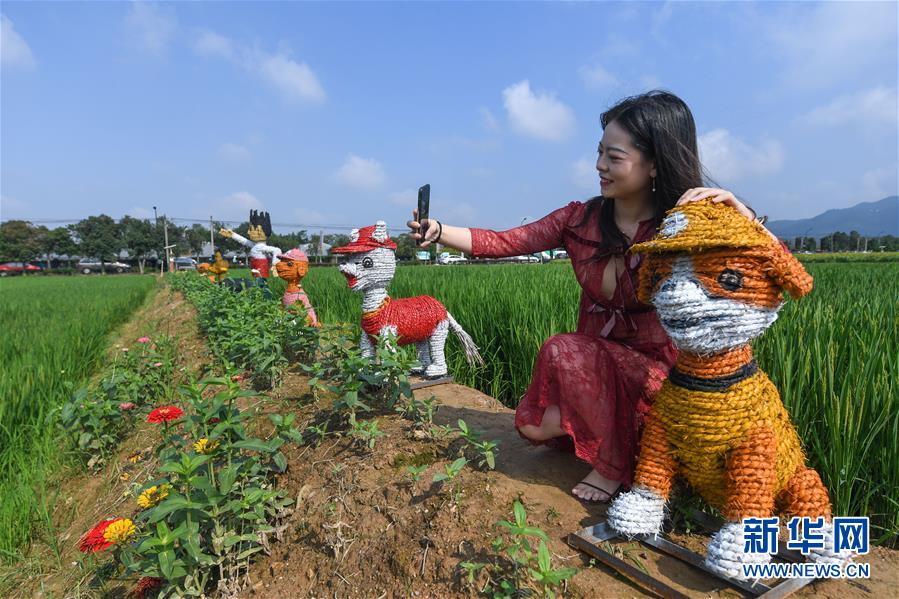 9月30日,游客在丰收节活动现场与稻草制作的卡通作品合影。 当日,浙江省义乌市佛堂镇龙溪村在万亩稻田中举办“庆丰收 迎国庆”丰收节活动。本次活动围绕“丰收有乐事”“丰收有看点”“丰收有味道”“丰收有逛头”四个板块开展。活动包括田园音乐会、农产品展销、美丽乡村广场舞大赛、村歌大赛、农田亲子趣味运动会、稻草人展示、原乡美食宴等内容。据介绍,丰收节已经成为当地展示乡村振兴成果、弘扬优秀农耕文化、拉动美丽乡村旅游和假期消费的重要节日。 新华社记者 徐昱 摄