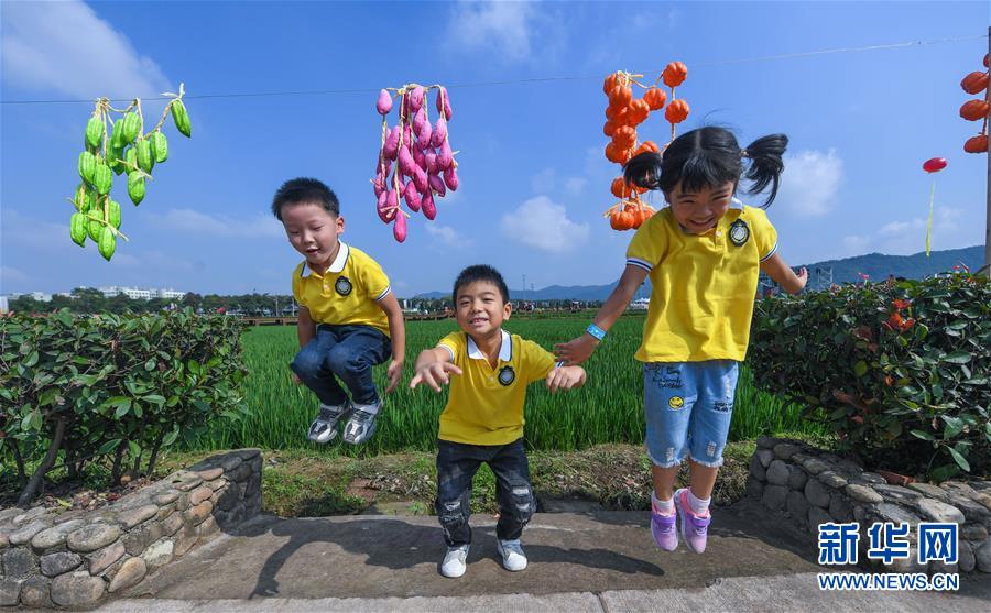 9月30日,孩子们在丰收节活动现场玩耍。 当日,浙江省义乌市佛堂镇龙溪村在万亩稻田中举办“庆丰收 迎国庆”丰收节活动。本次活动围绕“丰收有乐事”“丰收有看点”“丰收有味道”“丰收有逛头”四个板块开展。活动包括田园音乐会、农产品展销、美丽乡村广场舞大赛、村歌大赛、农田亲子趣味运动会、稻草人展示、原乡美食宴等内容。据介绍,丰收节已经成为当地展示乡村振兴成果、弘扬优秀农耕文化、拉动美丽乡村旅游和假期消费的重要节日。 新华社记者 徐昱 摄