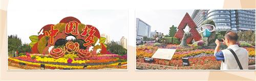 复兴门东北角布置“复兴伟业”花坛,以盛开的繁花为主景,嵌有“中国梦”字体,展示百花齐放共襄复兴伟业的美好祝愿。