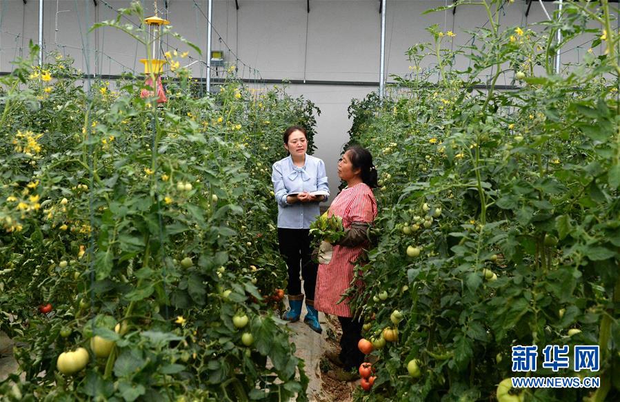 王萌萌(左)在安徽滁州西孔村产业扶贫基地向农户收集建议(5月8日摄)。新华社发(黄博涵 摄)