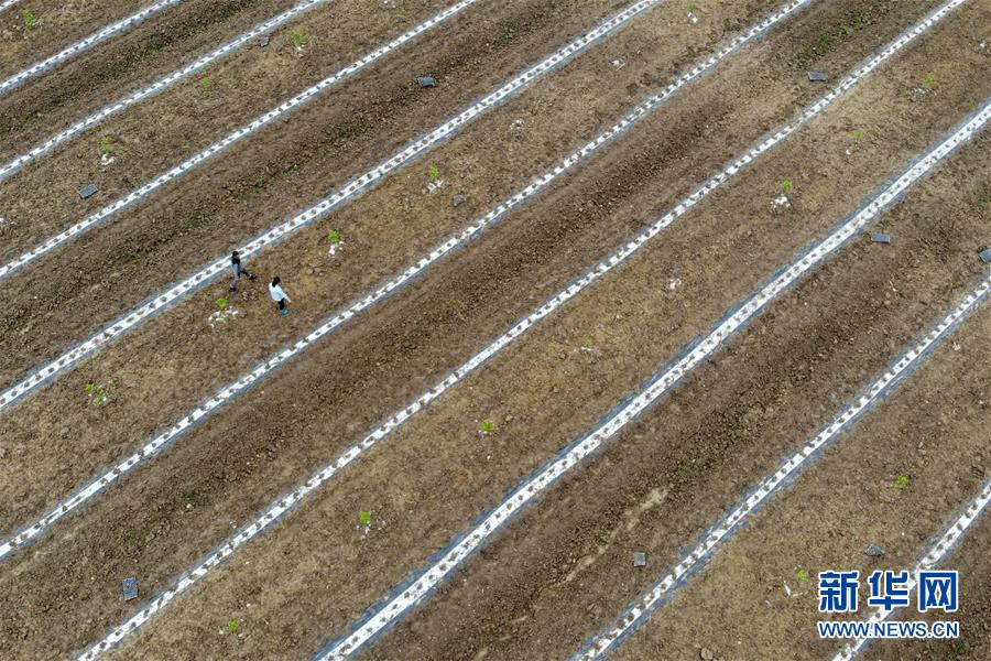 王萌萌(右)在安徽滁州西孔村山核桃基地调研(5月8日摄,无人机照片)。新华社发(黄博涵 摄)