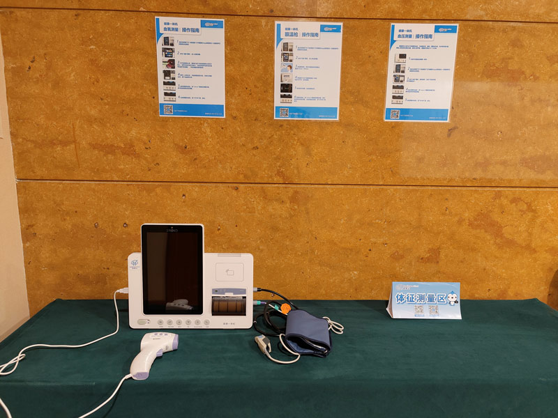 记者看到,北京饭店在入口设置了体温检测、安全检查,同时配备了防疫人员和核酸检测采样点,驻地设置了消毒用品,电梯里也设置一些防疫措施。