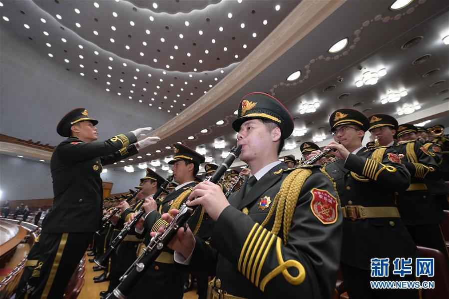 5月28日,第十三届全国人民代表大会第三次会议在北京人民大会堂举行闭幕会。这是军乐团在演奏。 新华社记者 李贺 摄