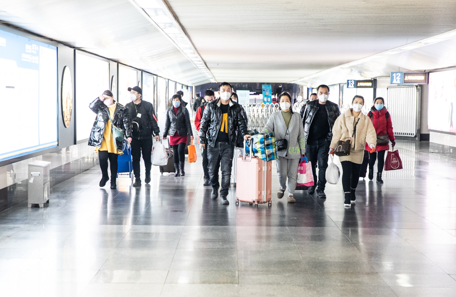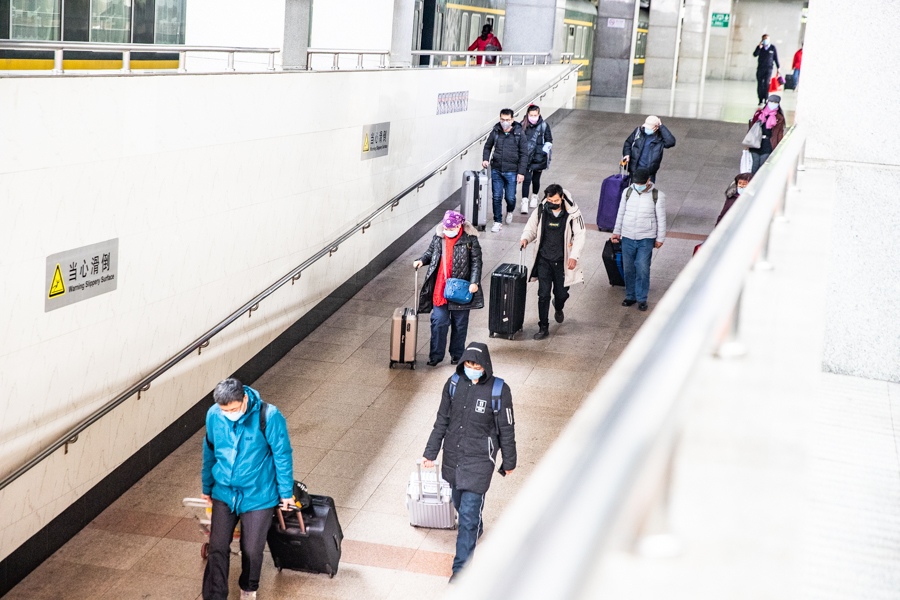 返程旅客戴着口罩拖着行李走出站台。新华网吴恺 摄
