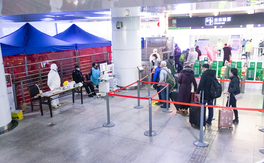 出站旅客依次排队测量体温,检查健康云信息。新华网吴恺 摄