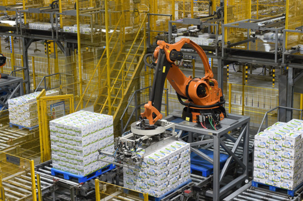 ↑2月11日,在呼和浩特市伊利液态奶生产基地,机器人在码放牛奶。新华社发(李志鹏 摄)