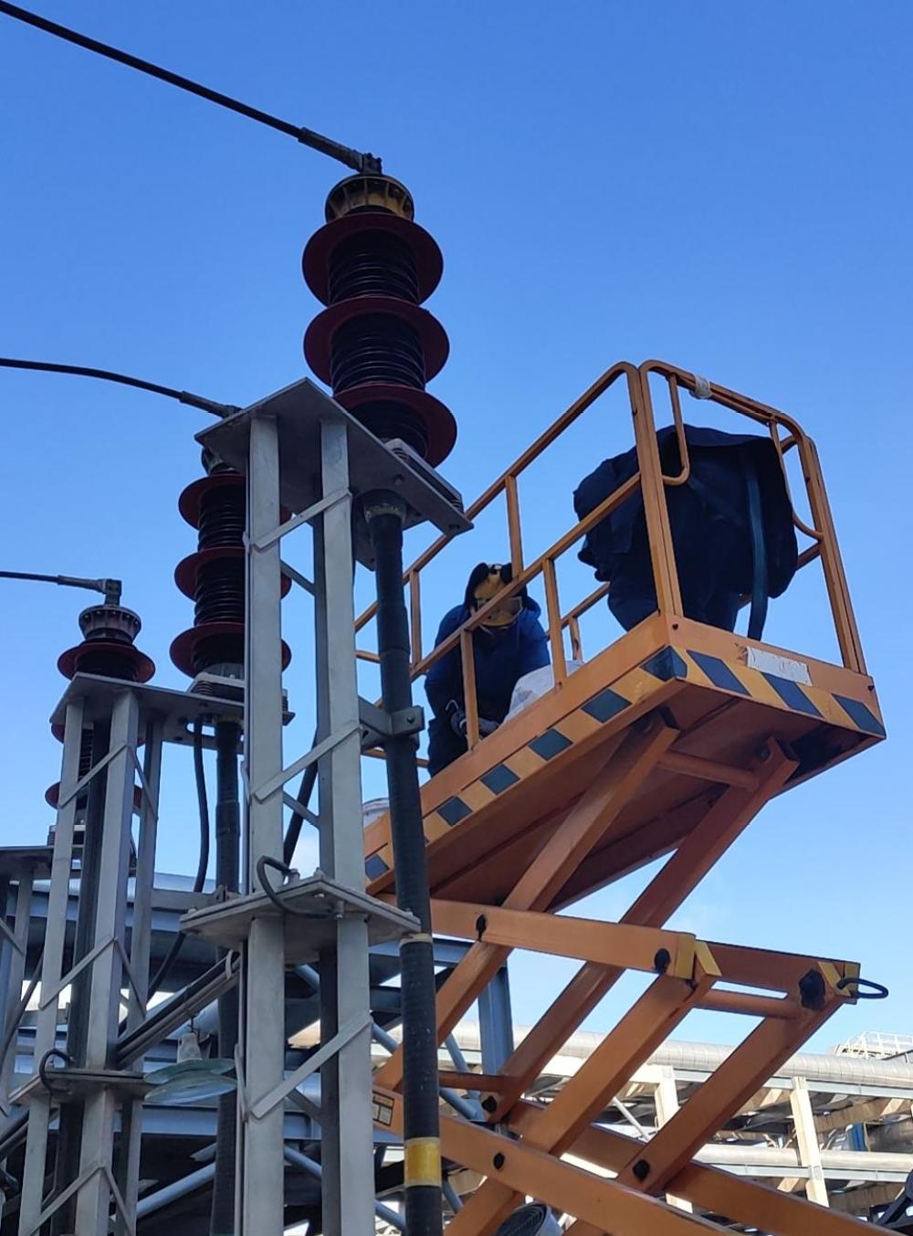 ↑电力公司工作人员检查供电设备,保障复产复工。