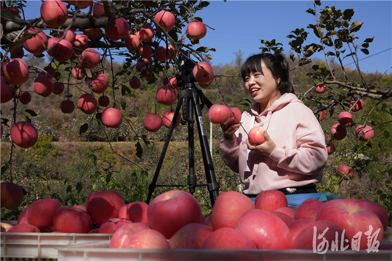 一名网络主播在河北省内丘县岗底村果园直播销售苹果。(河北日报资料片)