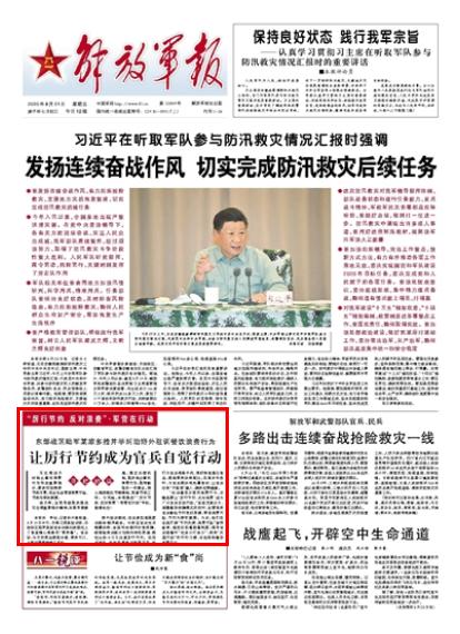 连日来,全军各级坚决落实习主席重要指示精神,采取有效措施,建立长效机制,坚决制止餐饮浪费行为,坚持勤俭办一切事业,深入推进部队节能降耗、资源节约工作。今天起,本报推出“‘厉行节约 反对浪费’·军营在行动”专栏,敬请关注!