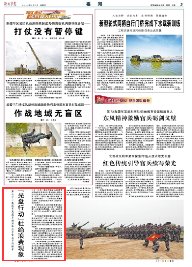 解放军报讯 陈超、记者李怀坤报道:8月15日一早,第71集团军某旅合成四营营长程骞照常到连队炊事班检查,偶然听见负责处理泔水的李师傅正在向营司务长“诉苦”:“路没少跑,但泔水桶里‘干货’却越来越少……”听到此话,程骞喜上眉梢:“这说明旅里开展的‘光盘行动’成效显著!”