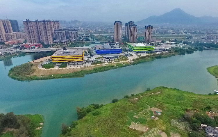 这是利用木兰溪流域旧河道开挖成的人工湖——玉湖。当地在此结合周边公共绿地,建设公共建筑,实现了现代建筑与自然景观浑然一体。