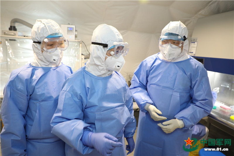 武汉一线,陈薇院士在检查移动检测实验室,中间者为陈薇院士,左侧为迟象阳。张振威摄