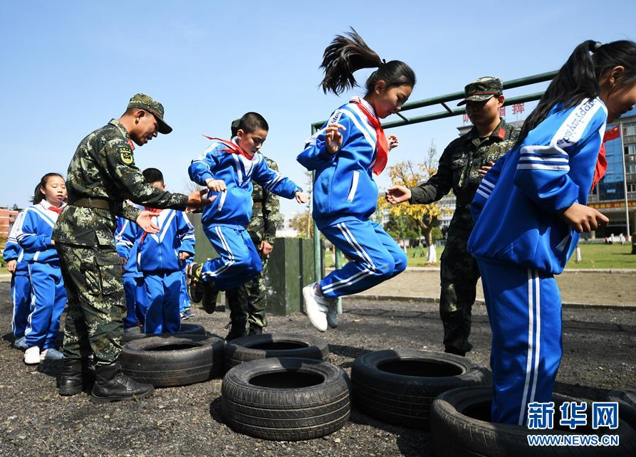 4月12日,学生在活动现场体验障碍训练。 在第四个“全民国家安全教育日”来临之际,重庆市九龙坡区白市驿镇第二小学的300余名学生走进武警重庆总队执勤第一支队机动大队参观体验,近距离感受军旅生活,接受国防教育。 新华社记者 王全超 摄