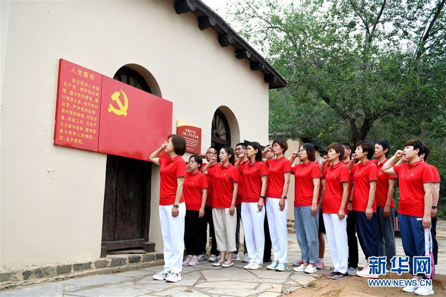 6月28日,在河北省石家庄市平山县西柏坡七届二中全会旧址,石家庄市人民医院12名援鄂抗疫新党员与老党员一起重温入党誓词。(陈其保 摄)