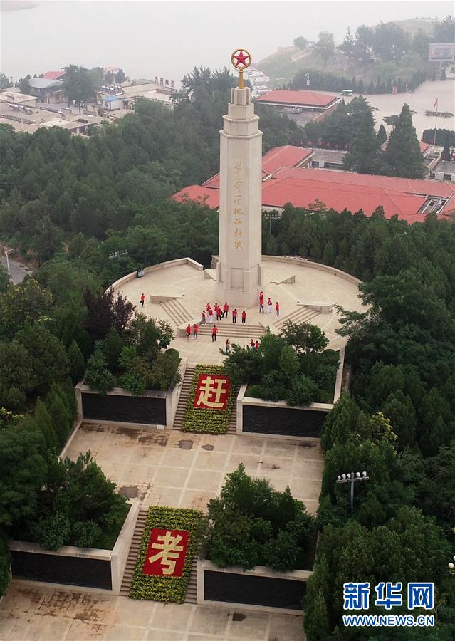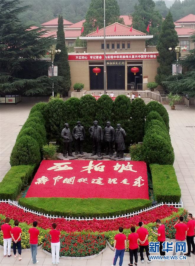 6月28日,在河北省石家庄市平山县西柏坡,石家庄市人民医院援鄂抗疫新党员参观西柏坡纪念碑(无人机照片)(梁子栋 摄)
