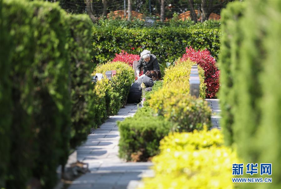 4月2日,在上海福寿园公墓,预约现场祭扫的市民在祭奠亲人。 新华社记者 丁汀 摄