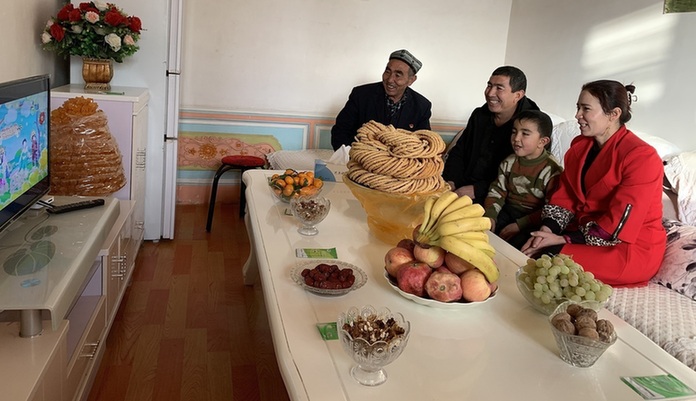 阿卜都克尤木·肉孜一家三代人正在新装修的客厅看电视。阿尔达克摄