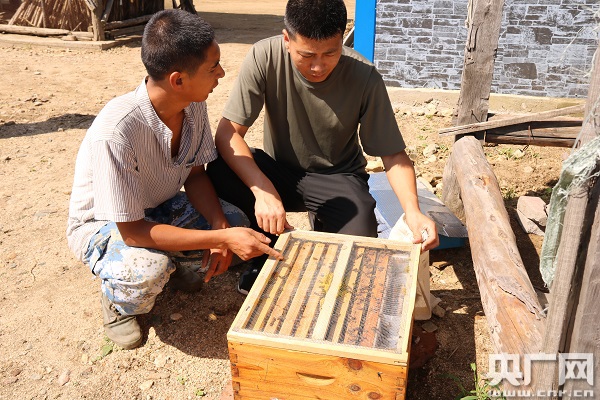 长安村驻村第一书记杨立山查看蜂箱(央广网发 驻村工作队供图)