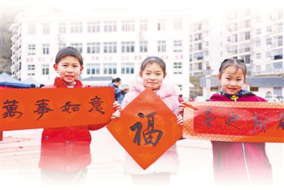 湖北恩施土家族苗族自治州宣恩县的小朋友们展示春联。王俊摄(人民视觉)