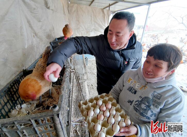 国网饶阳县供电公司驻豆村第一书记刘月伦(左)帮农户收鸡蛋。 河北日报记者焦磊 摄