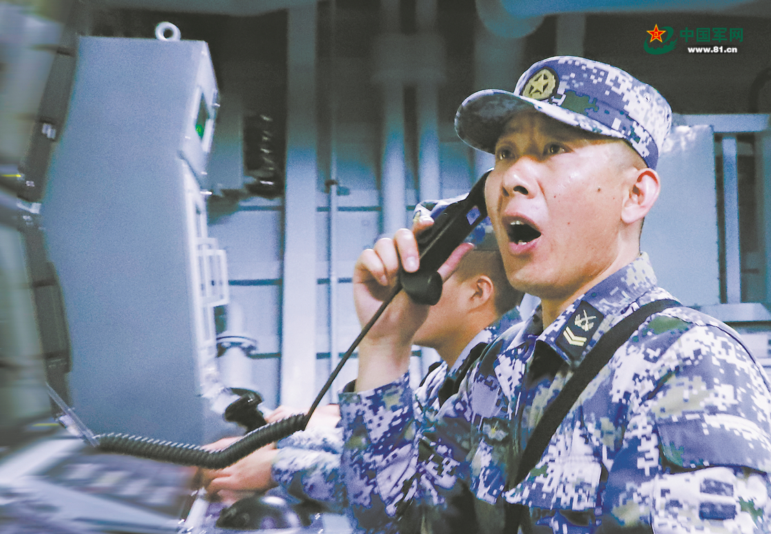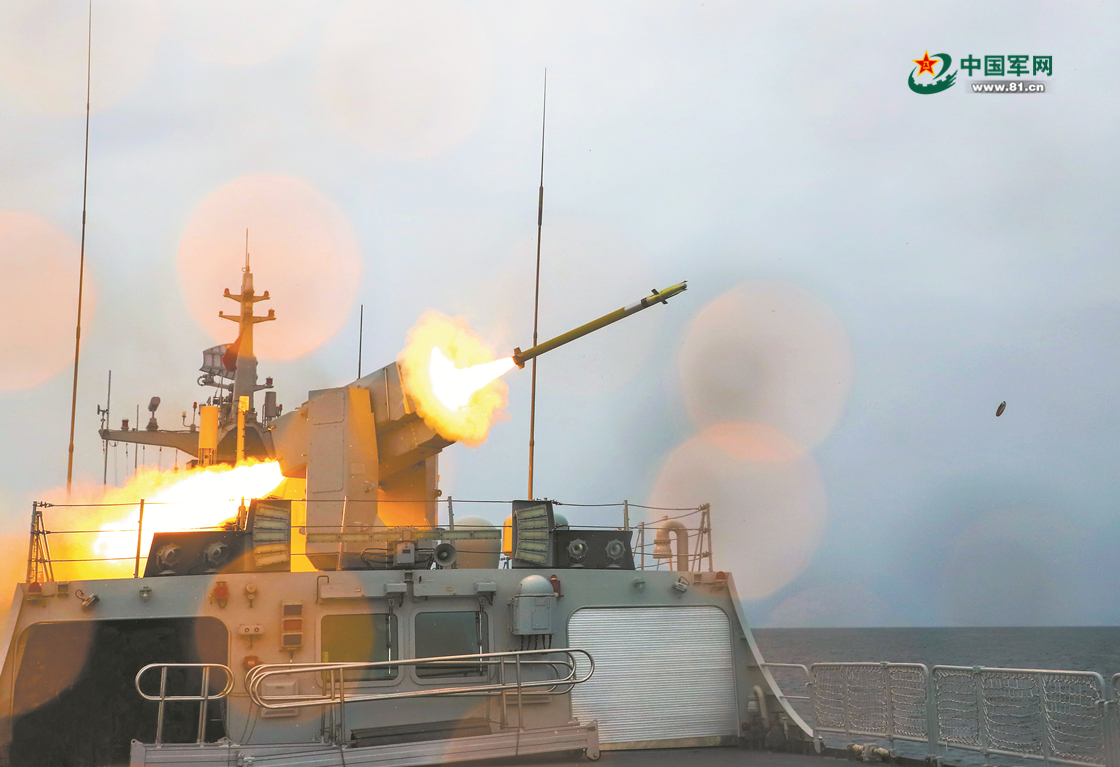 “开火!”指挥员下达作战命令。黄石舰上,防空导弹拖着红色尾焰呼啸而出,直扑“敌”机。信阳舰上,主炮喷吐烈焰,对“敌”舰实施有效火力打击……