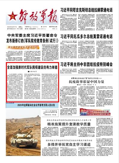 习主席日前签署命令,发布新修订的《军队院校教育条例(试行)》。这是深入贯彻新时代军事教育方针的具体部署,是全面加强新时代军队院校建设的有力举措,对于开创新时代院校教育和人才培养新局面,具有重要意义。
