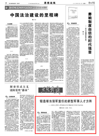 实现党在新时代的强军目标、把人民军队全面建成世界一流军队,迫切需要培养德才兼备的高素质专业化新型军事人才。与会代表表示,要切实增强锻造新型军事人才方阵的使命感责任感。国防大学作为培养联合作战人才和高中级领导干部的重要基地,在新型军事人才队伍建设上使命光荣、责任重大。要深入学习贯彻习主席关于新时代军事教育的重要论述,始终牢记习主席2016年视察国防大学时的重要讲话和2017年对国防大学的训词,准确把握新时代学校建设的历史方位和办学定位,努力为构建“三位一体”新型军事人才培养体系发挥重要作用。