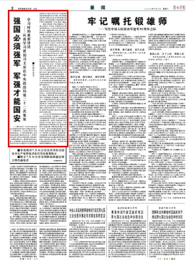 八一建军节前夕,中共中央政治局就加强国防和军队现代化建设举行第二十二次集体学习,习主席主持学习并发表重要讲话。习主席的重要讲话,站在坚持和发展中国特色社会主义、实现中华民族伟大复兴的战略高度,深刻阐述了统筹发展和安全、富国和强军的重大意义,总结回顾了我党我军积极推进国防和军队现代化建设的非凡历程、战略安排和巨大成就,科学分析了当前国际战略形势和国内安全环境,并对实现国防和军队建设2020年目标任务提出明确要求,作出具体部署,为推进国防和军队现代化建设指明了方向、提供了遵循。