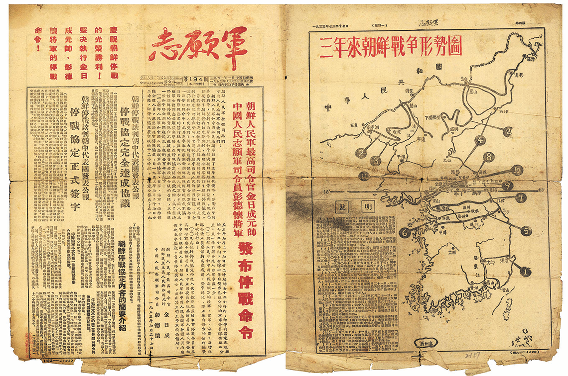 1953年7月27日10时,朝鲜战争交战双方谈判代表在板门店签字大厅签署停战协定。12小时后,朝鲜战场全线停火,历时两年零9个月的抗美援朝战争结束。这一消息通过电波、电文、报纸迅速传遍世界。与此同时,一份由中国人民志愿军司令部、政治部发行的《志愿军》报,像插上了翅膀传遍志愿军前线阵地的每一个角落。这份报纸头版头条刊登了“朝鲜人民军最高司令官金日成元帅、中国人民志愿军司令员彭德怀将军发布停战命令”,命令宣布:自1953年7月27日22时起,即停战协定签字后的12个小时起,全线完全停火,并命令部队坚决遵守停战协定。同时,保持高度戒备。