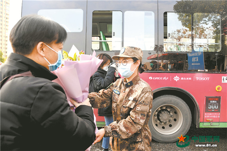 火神山医院医护人员给出院患者献花。解放军报记者王传顺摄