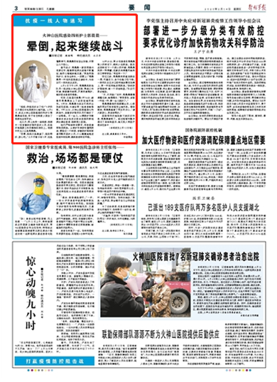 10时05分,第25位患者在郭晨晨等人的转运下,顺利入住病房。就在返回转运下一个病人的时候,郭晨晨突然一阵寒颤,但意识尚清醒的她和自己暗暗较劲:“再坚持一下!”