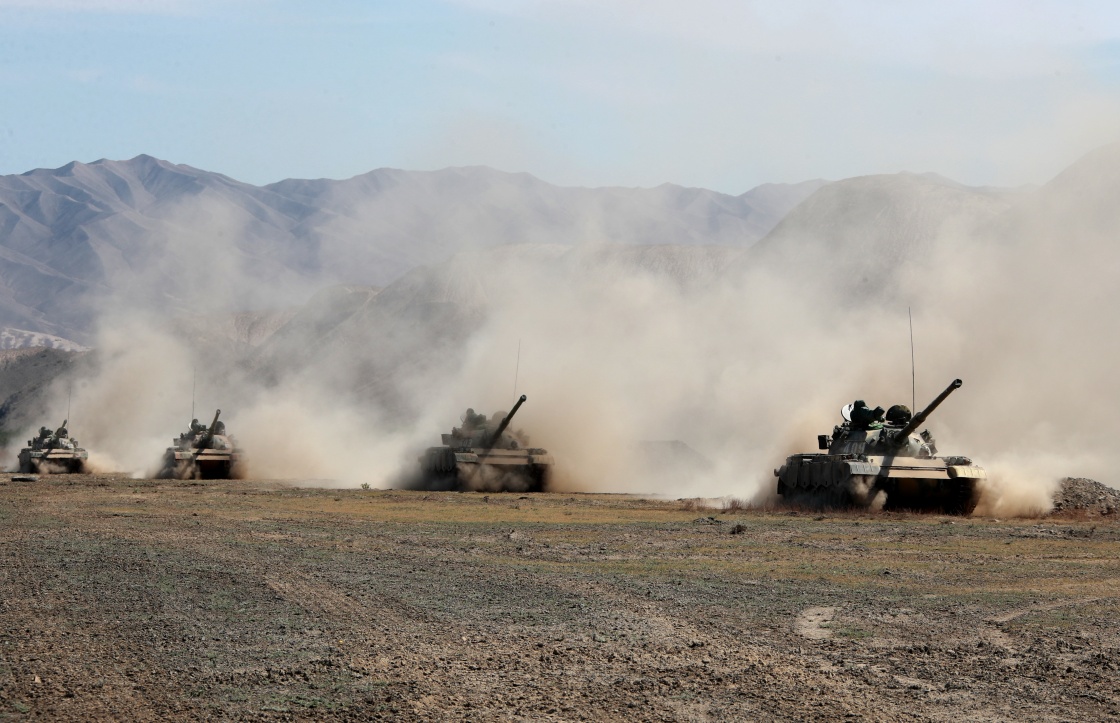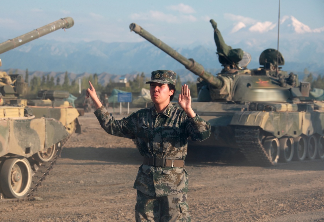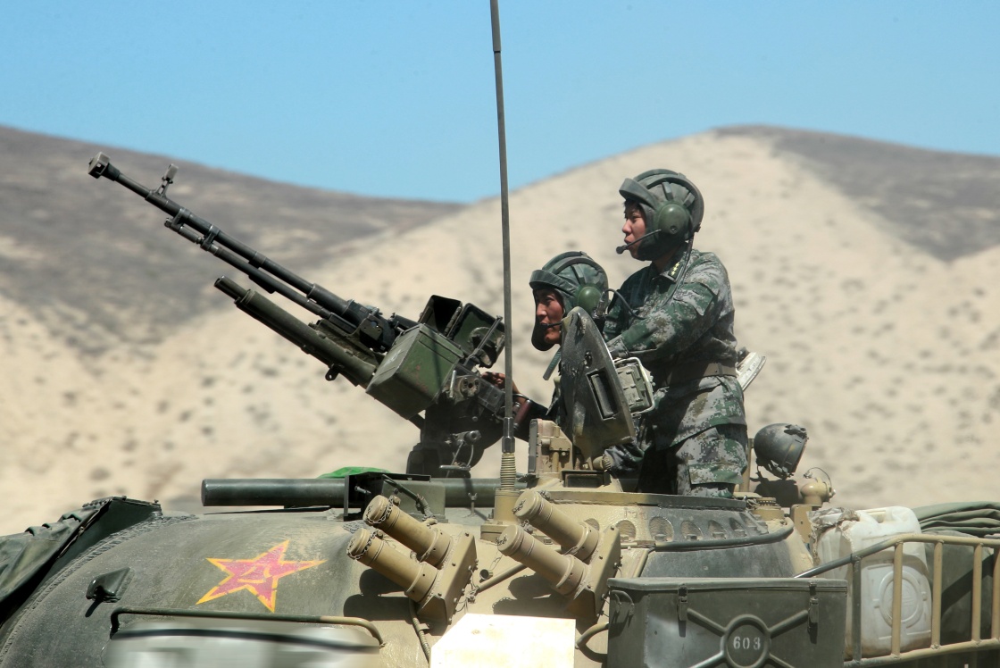 新疆军区某合成团坦克二连指导员马和帕丽驾驶坦克带领连队冲锋在前(7月9日摄)。(袁凯 摄)