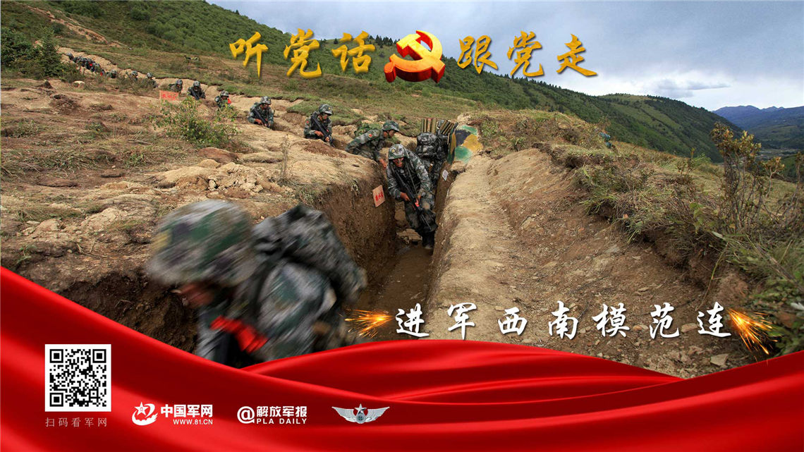 “进军西南模范连”官兵在堑壕里迅速奔向战斗岗位。