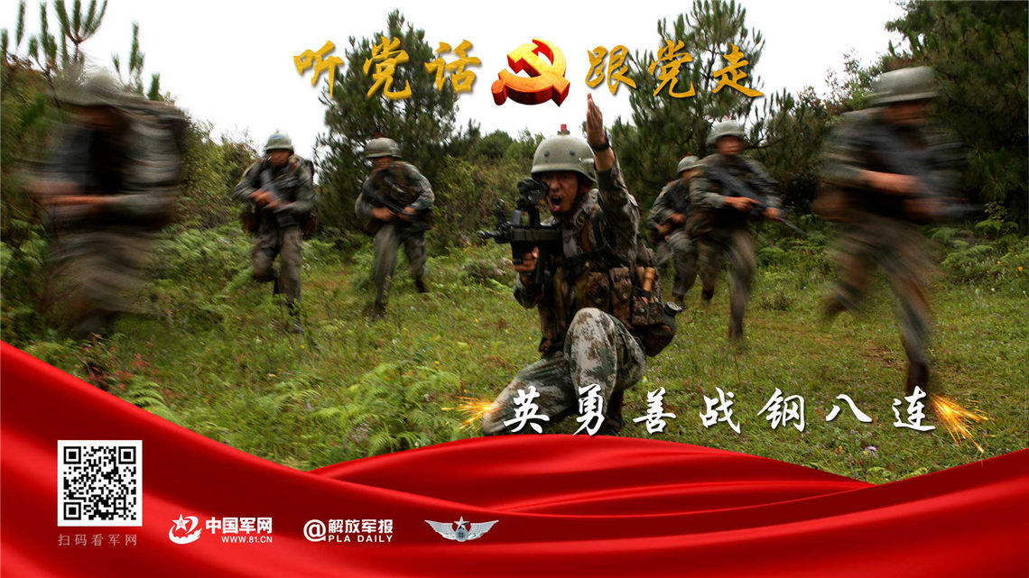 “英勇善战钢八连”官兵进行山地进攻演练。
