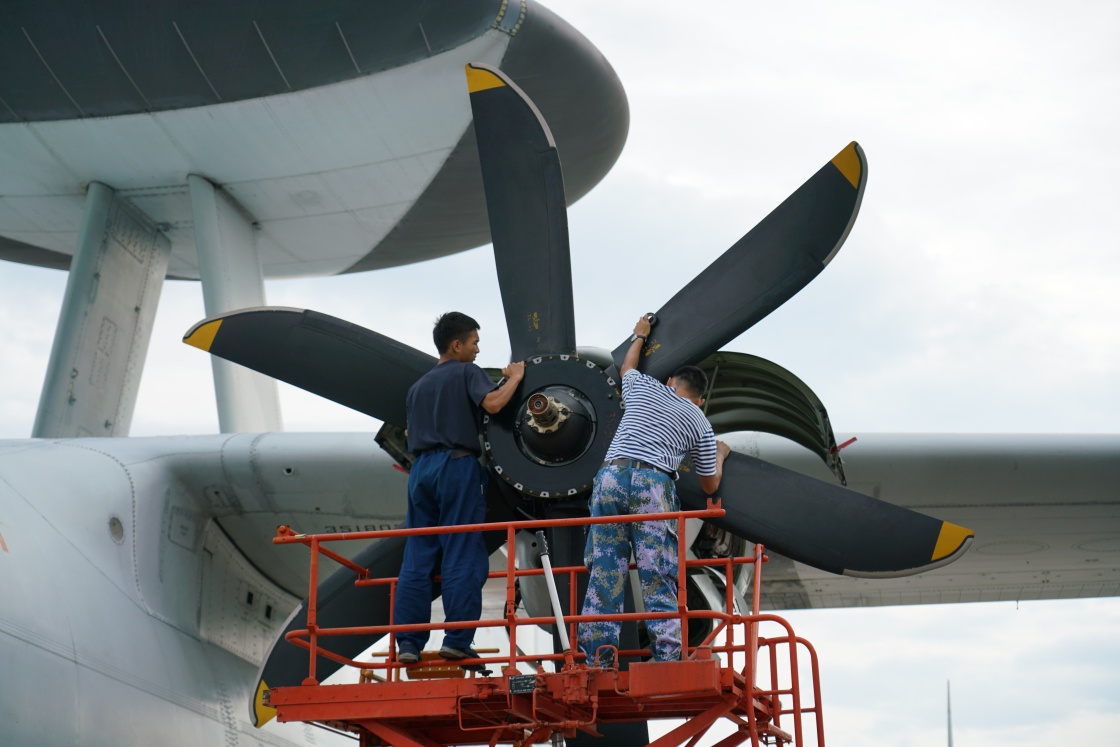 南部战区海军航空兵某师官兵对战机螺旋桨进行检查保养(8月27日摄)。新华社发(邱晓涛 摄)