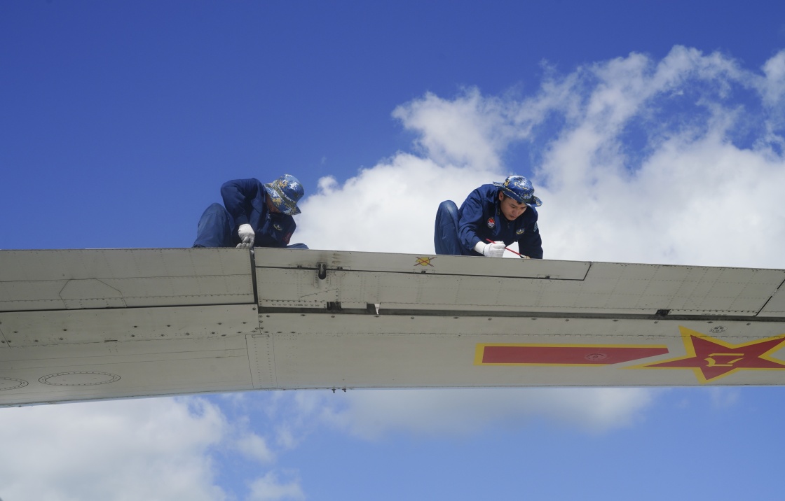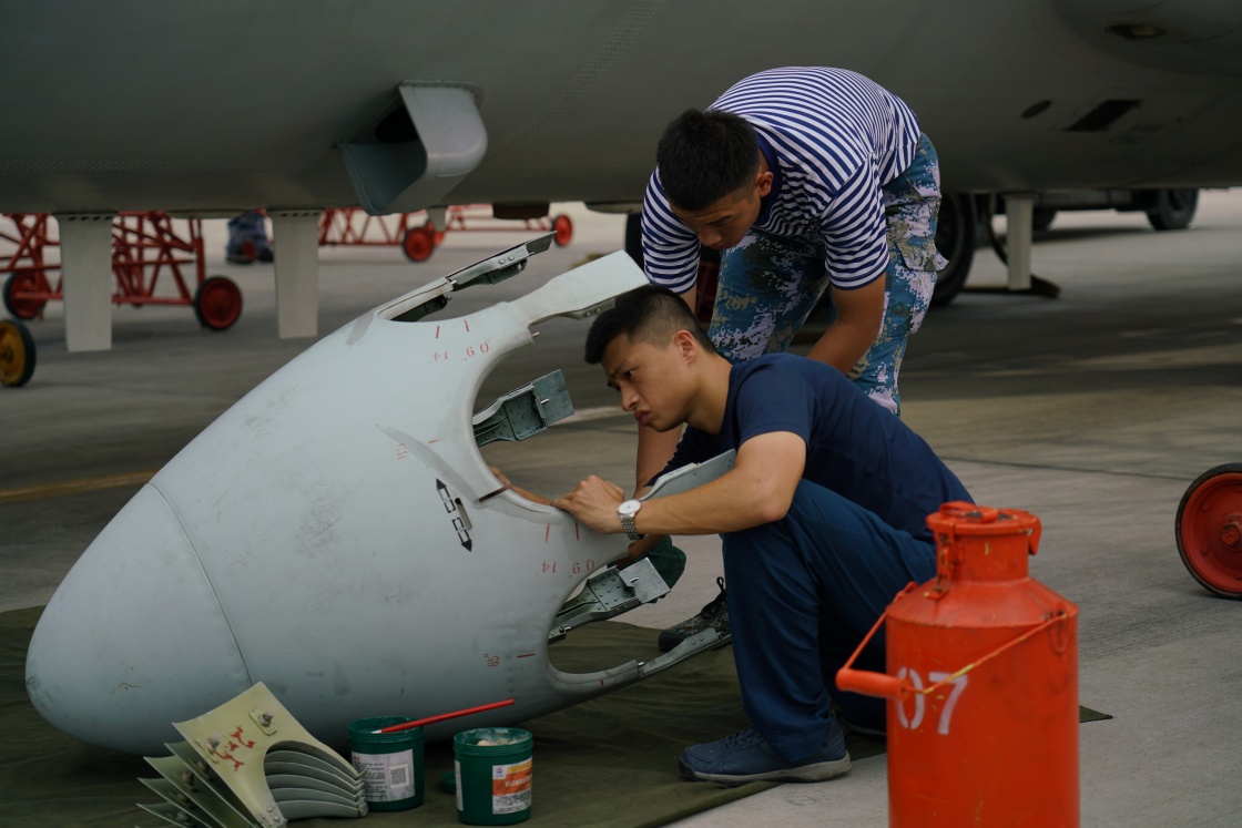 南部战区海军航空兵某师官兵对战机机翼进行检查保养(6月12日摄)。新华社发(邹济南 摄)