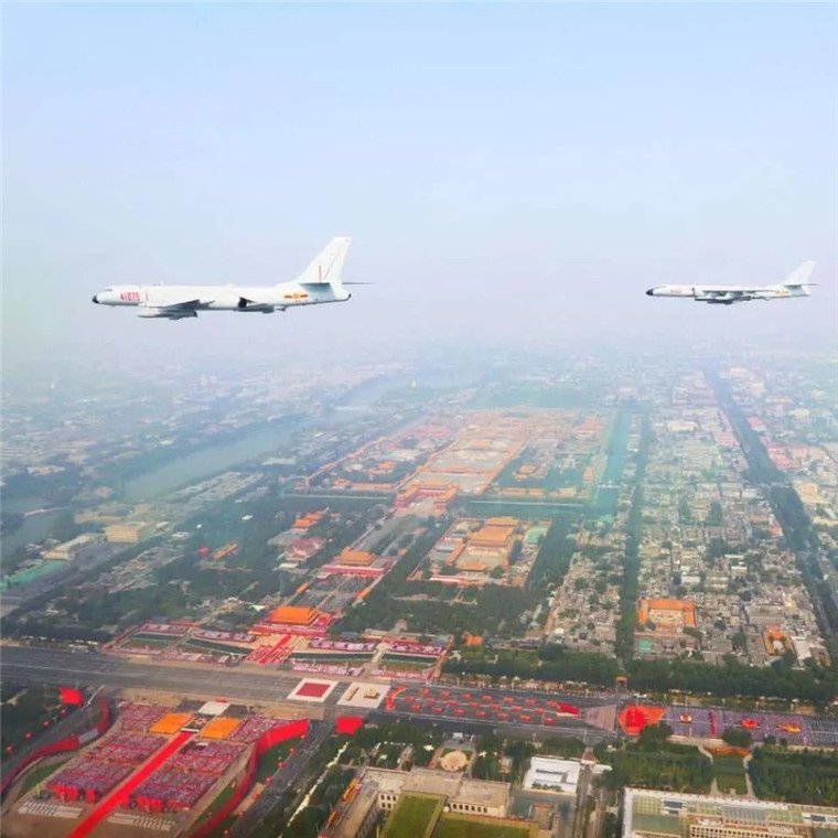 庆祝新中国成立70周年阅兵式上,轰炸机梯队飞临天安门广场上空接受检阅。