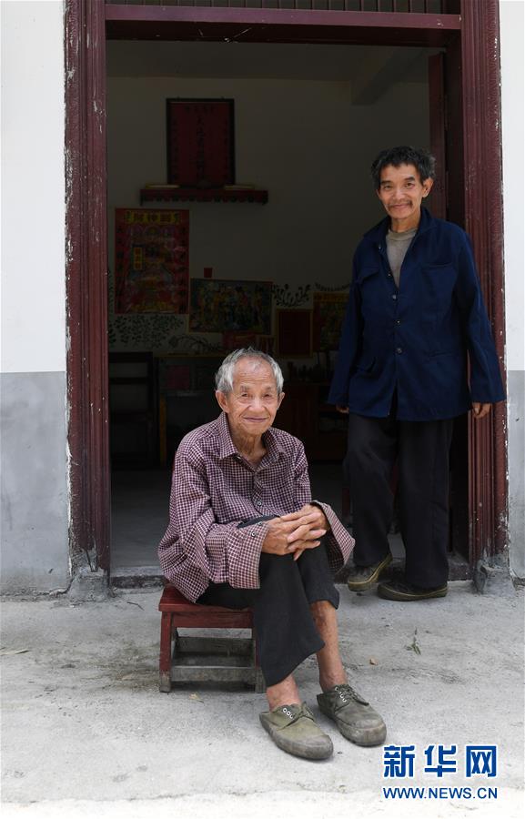 在广西环江毛南族自治县下南乡下塘村上眉屯,搬迁户谭广田(右)和父亲谭运日在家门口(5月23日摄)。 新华社记者 陆波岸 摄