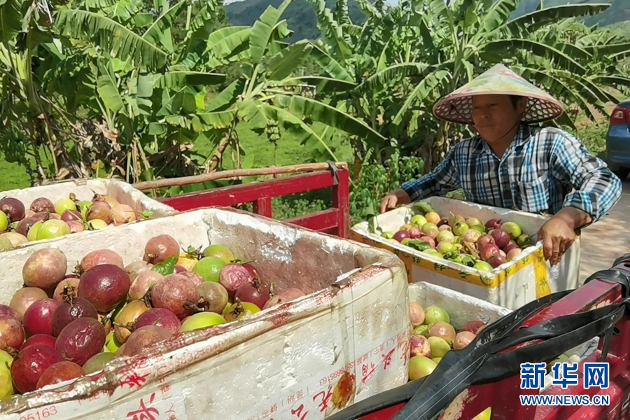 在洞浪百香果基地务工的村民正在将百香果搬运上车,准备运往扶贫车间打包销售。新华网 刘君 摄